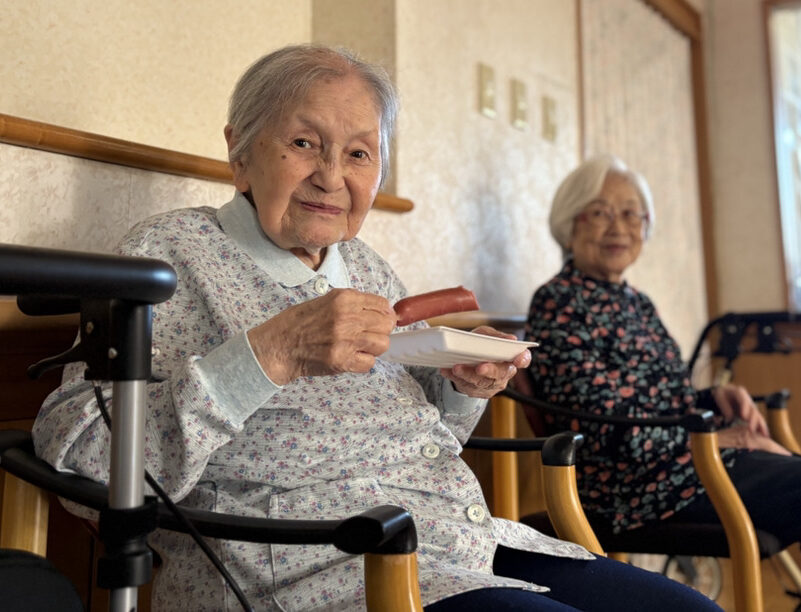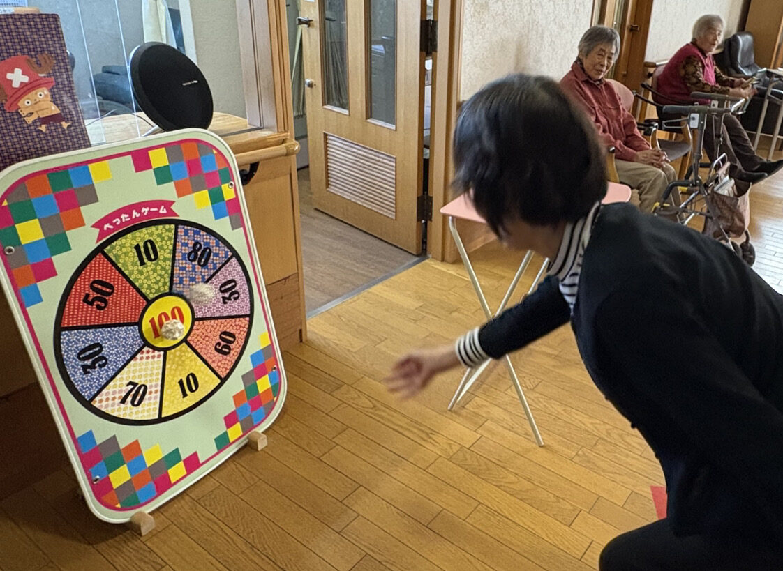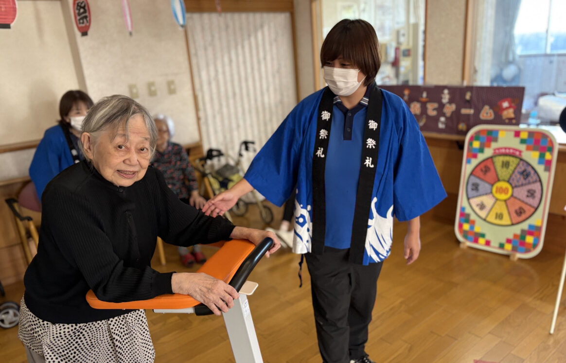 10月末、施設内で秋祭りを開催しました。いつものデイルームがお祭り会場に一変。みなさん、すてきな笑顔で、とても盛り上がっていました。