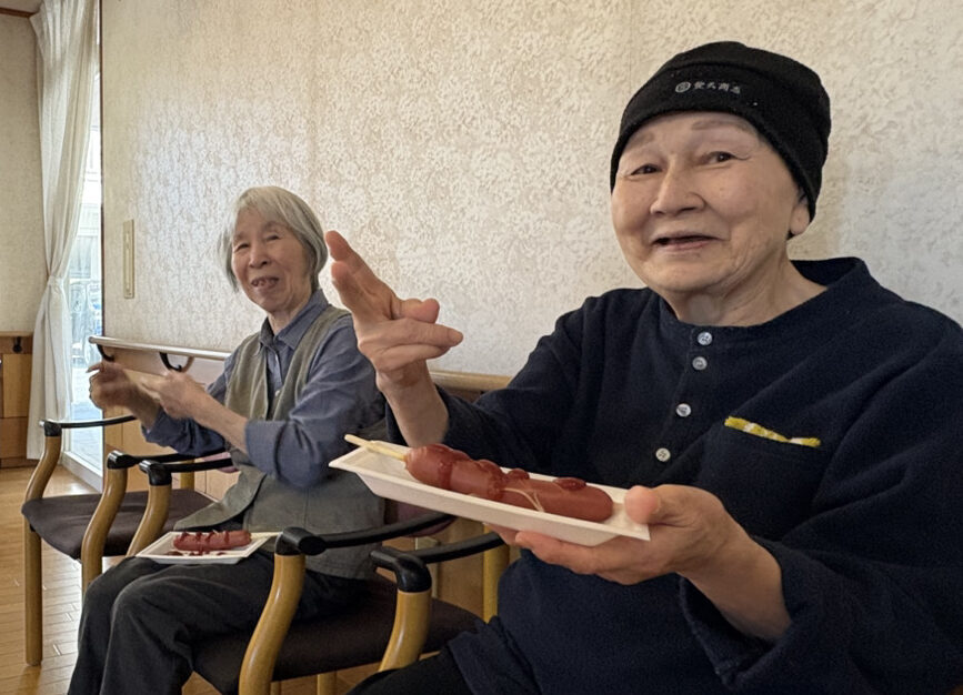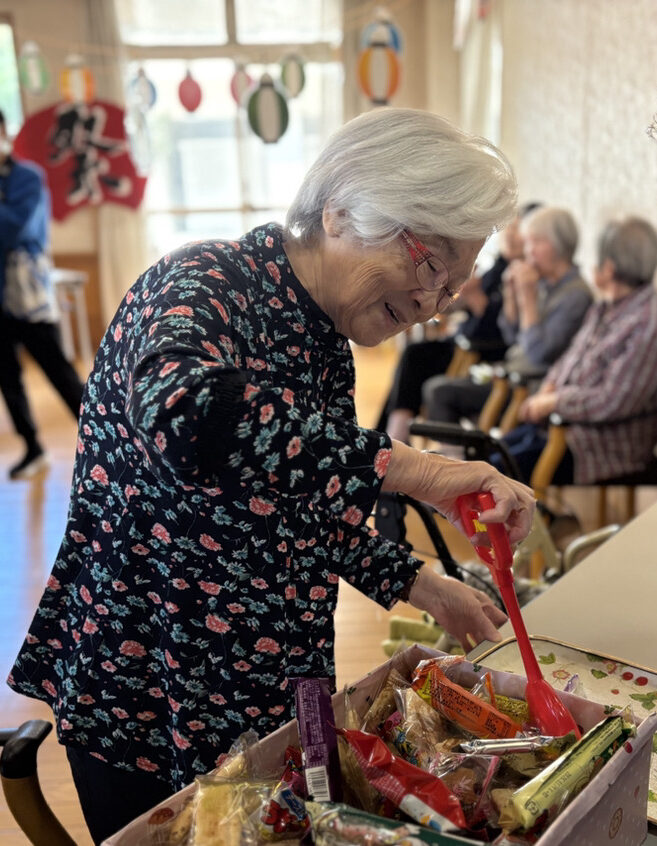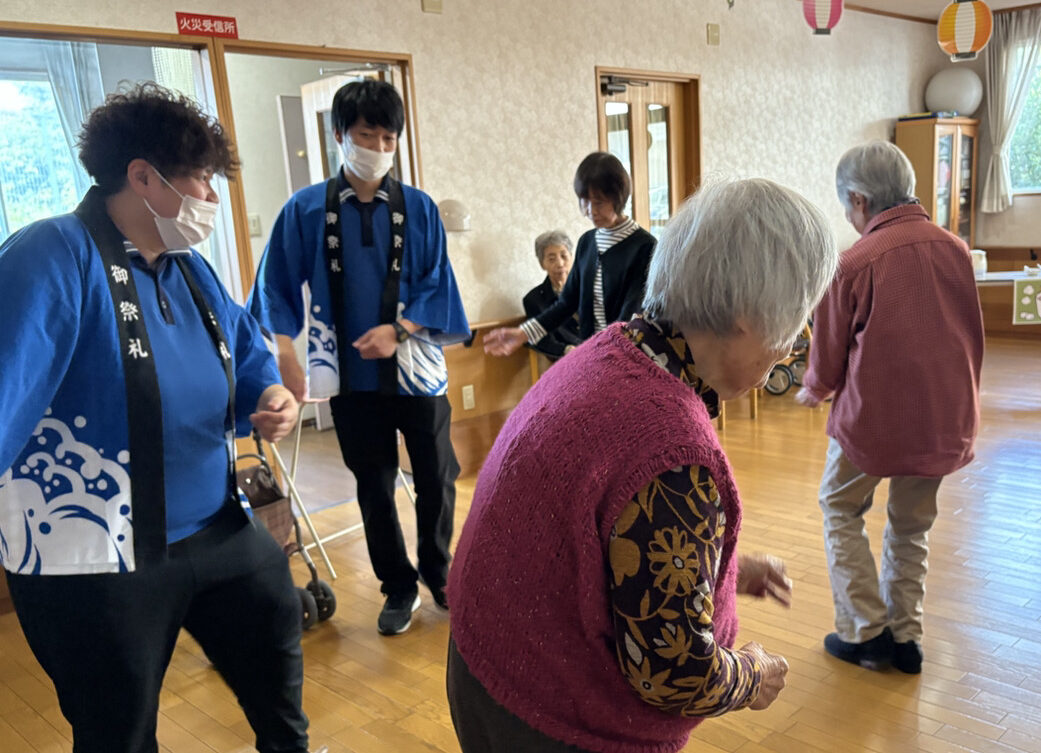 10月末、施設内で秋祭りを開催しました。いつものデイルームがお祭り会場に一変。みなさん、すてきな笑顔で、とても盛り上がっていました。