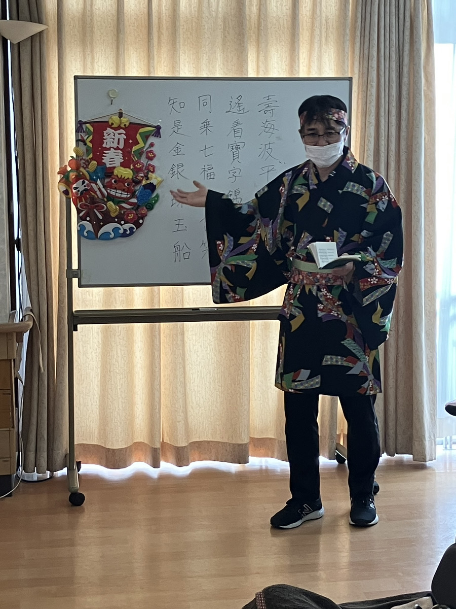 そして、小寺介護士が詩吟を披露されました。正月らしい「たからじま」という演目を実演され、皆さん興味深く聞かれています。