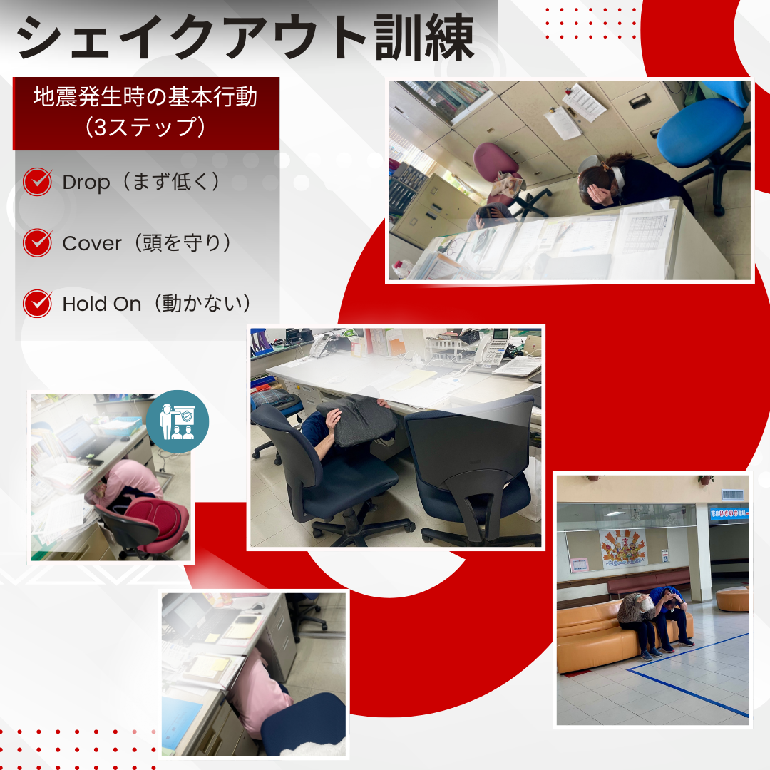 本訓練は、地震発生時に「まず低く」「頭を守り」「動かない」という3つの行動で、自身の身を守ることを目的としたものです。