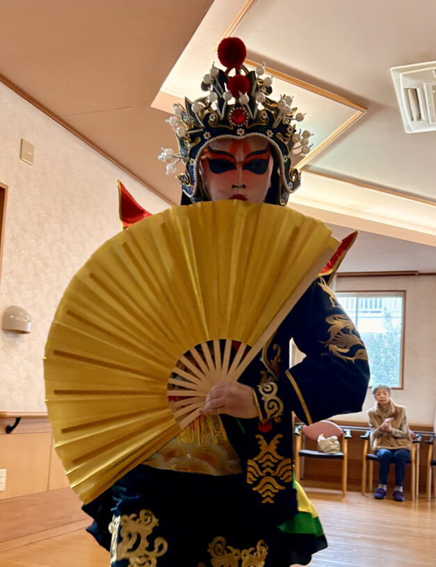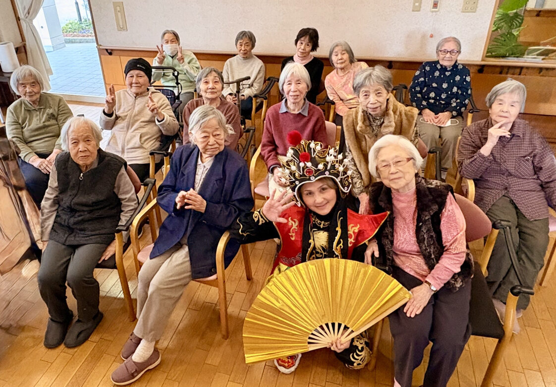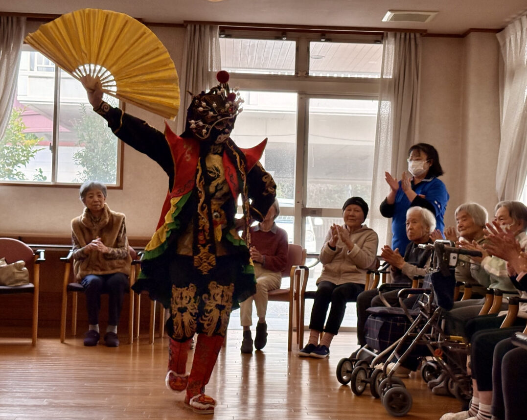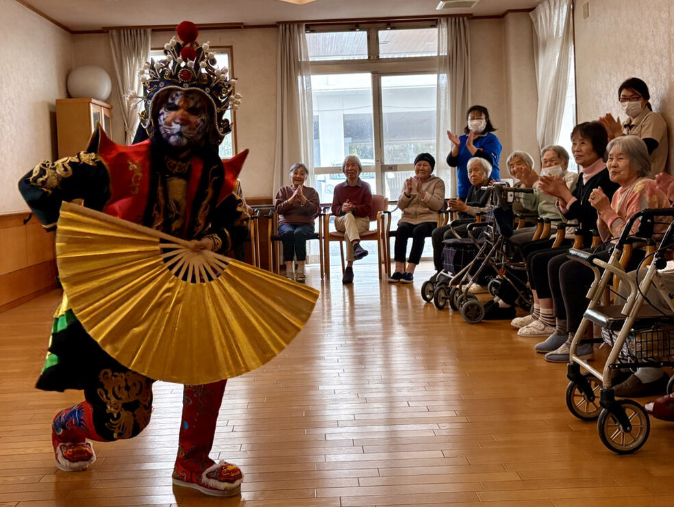中国の伝統芸能である変面ショーをお楽しみいただきました。瞬時に顔の仮面が変わる不思議なパフォーマンスに、入居者様は手拍子や歓声で応え、演者とのハイタッチも楽しまれていました。