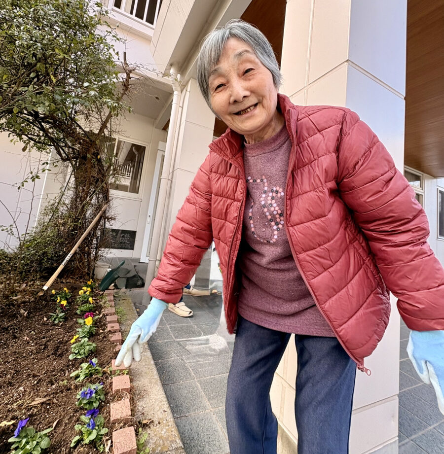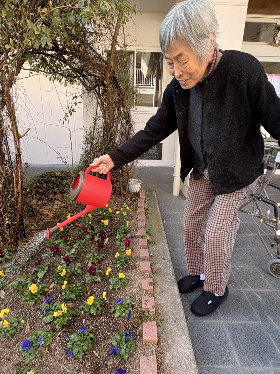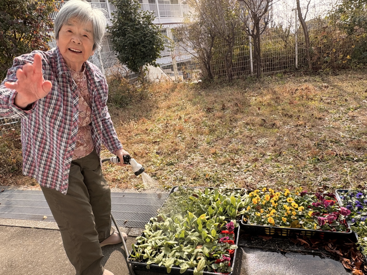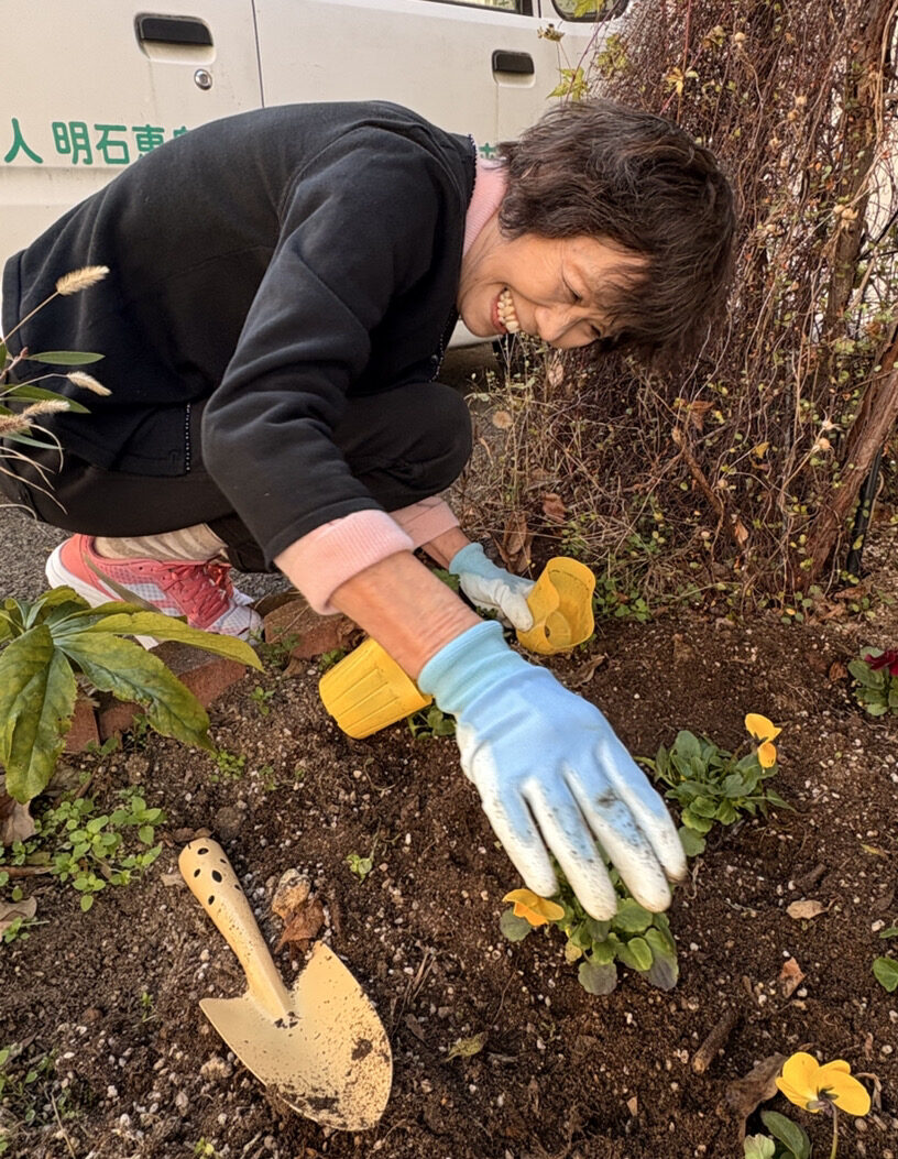 明石市主催の花壇コンクールに向けて、入居者様と一緒に花植えを行いました。まず草引きや落ち葉拾いで花壇を整え、その後、春に向けて色とりどりの花を植えました。