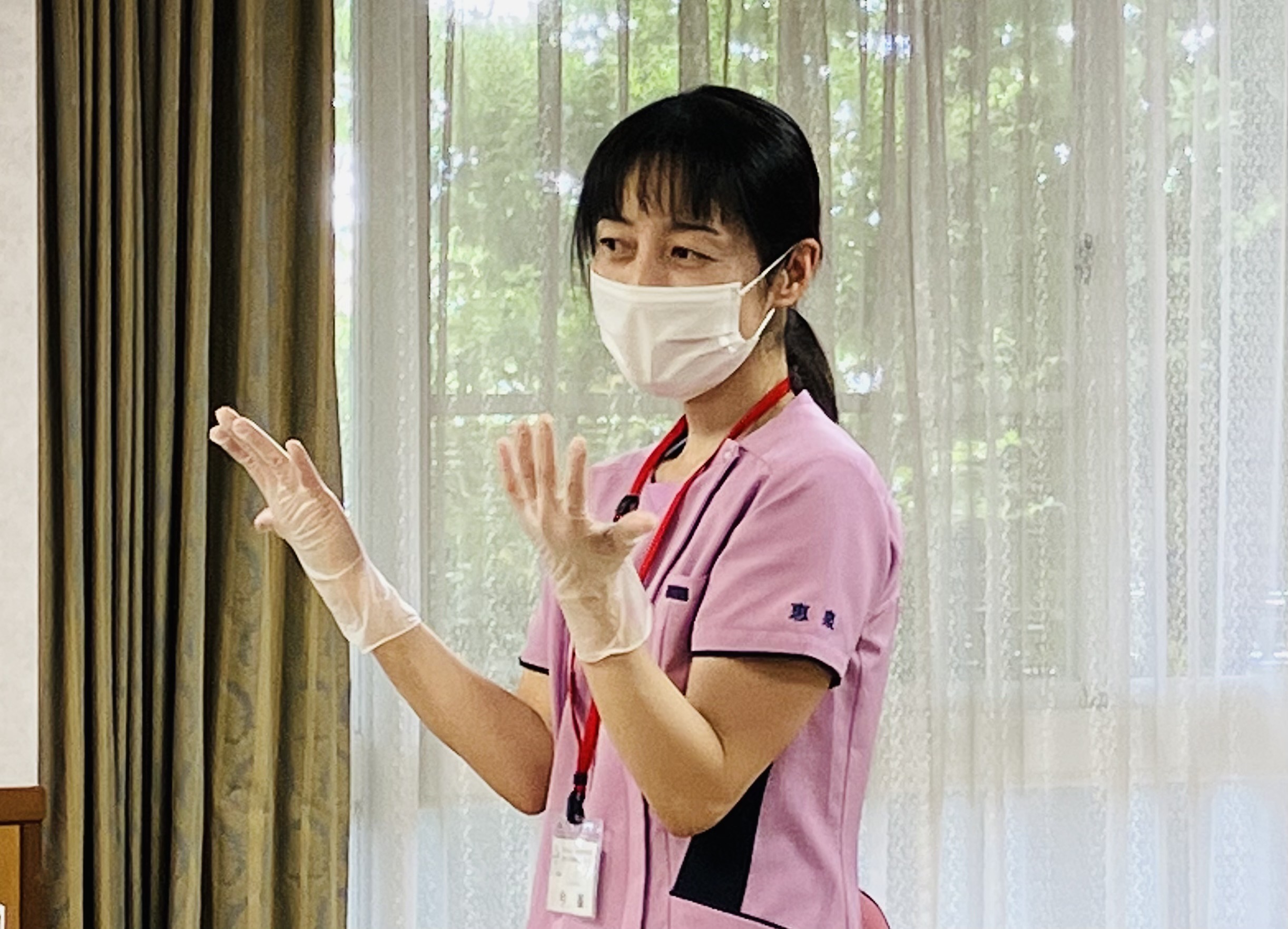 給食提供を管理する栄養士も真剣に演習に取り組みます。日常的に手袋を使用する介護職員も出来て当たり前と慢心していないか再チェック!
