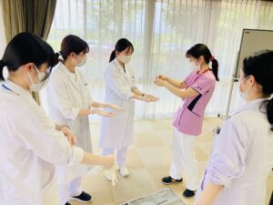 また、感染防止においては確かな手技が求められます。各施設の看護師指導のもと訓練を実施しました。使い捨て手袋の正しい着脱方法を学びながらチェック。手袋にたっぷりと絵具をペイントし、手指や手首、周辺を汚さぬように取り外す訓練です。
