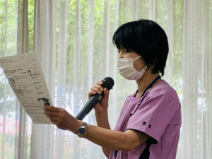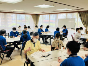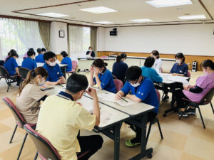 実技訓練を終えて老人保健施設・上原看護師長からの振り返りとまとめを受け、多くの職員が知識と技術の再習得をしました。